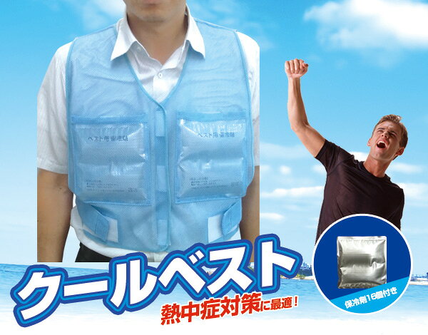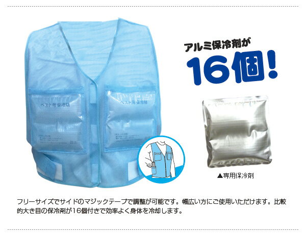 ●ベスト用保冷剤を、冷凍してベストに4個ポケットイン ●室温40℃で8時間勤務の場合、2〜3時間毎にベスト用保冷剤の入れ替えを想定して、1回4個×1日4回、ベスト用保冷剤を16個もご用意 商品仕様 ●セット内容:ベスト×1着、アルミ保冷剤×16個 ●サイズ:フリーサイズ(着丈43cm) ●重量:ベスト/約110g、アルミ保冷剤/160g/個 ●その他:異物混入防止の為、ファスナーは使用しておりません。